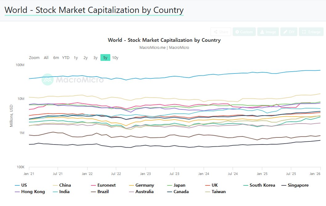 한국이 엄청 경제적으로 잘 나가는 국가 같아도 아직 시총으로는 인도(4위)에도 못 미치는 작은 국가일 뿐이다. 자신의 위치를 똑바로 파악하는 게 투자의 첫걸음이다.