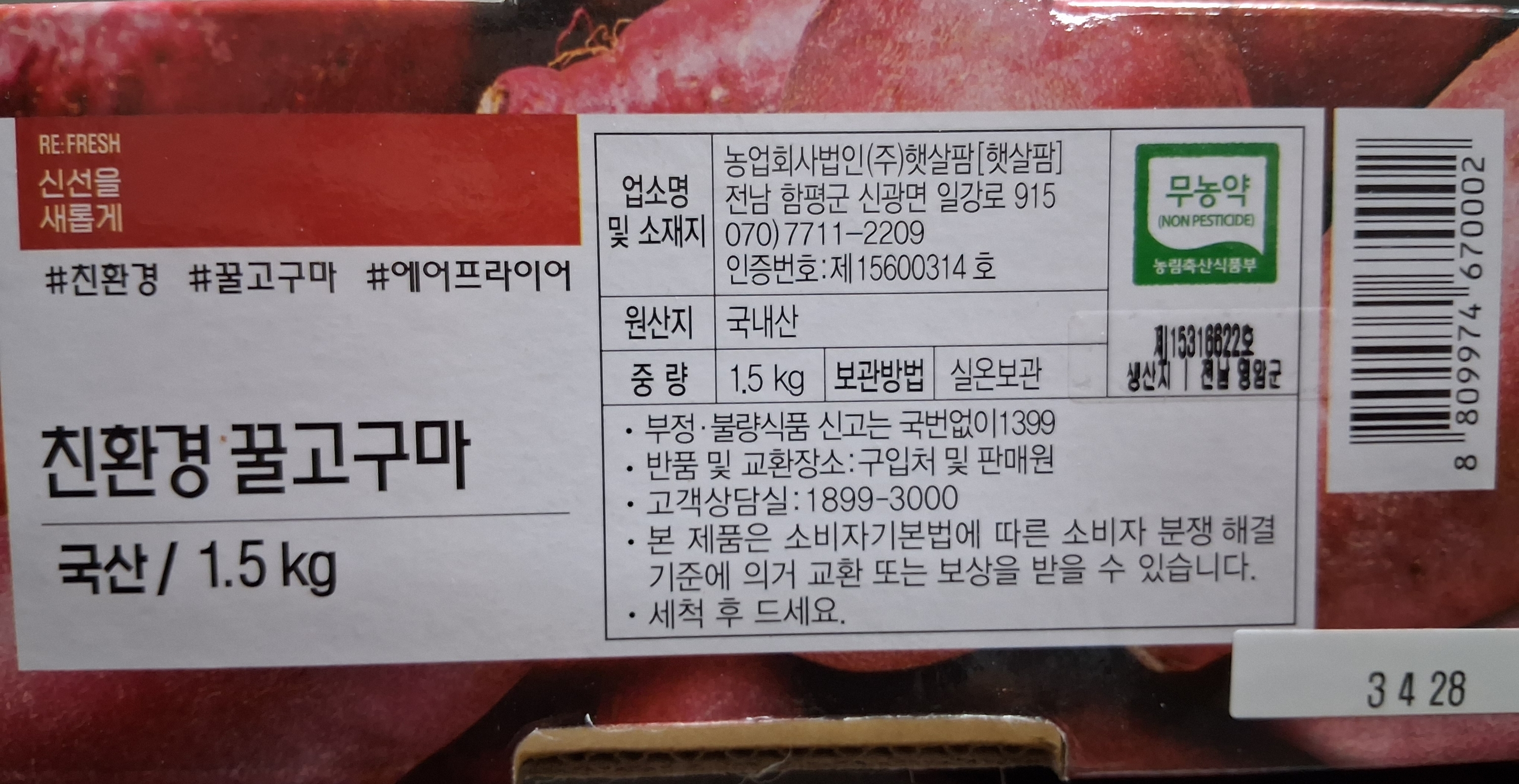 고구마는 수확철이 8~10월로 한정돼 있다고 하니 참고만 할 것. 실상은 농협에서 생산한지 1년이 넘은 썩기 직전 고구마조차도 마치 신상처럼 판매한다는 점임. 이번에 롯데마트에서 구매한 고구마는 생산일자도 표기 안 돼 있음.