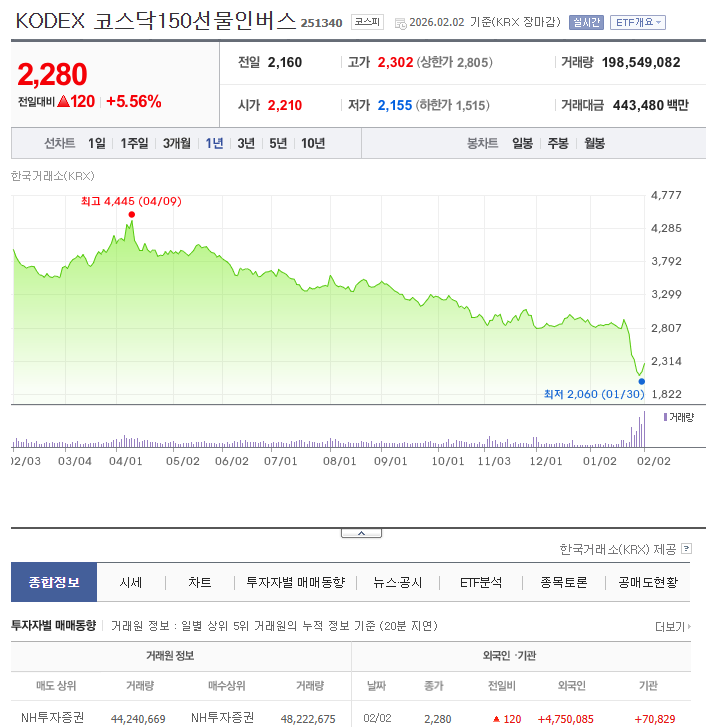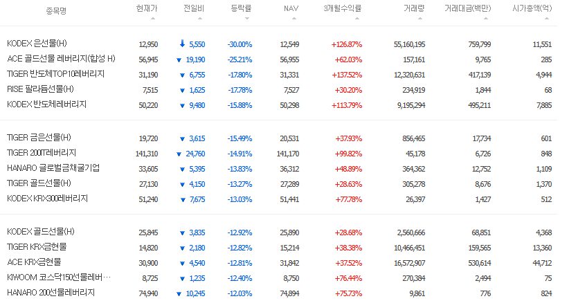 최근 증시는 정말 예전에 나타났던 현상들이 되풀이되지 않는 '뉴노멀'로 진입했다고 생각이 될 정도로 예측불허의 요물이 돼버렸다. 금, 은이 이렇게 단기간내 폭등과 폭락을 거듭한 것은 유래없는 현상이다. (코스피나 코스닥이 장기간 급상승 한 것도 유래없는 현상). 따라서 이러한 세기말적인 뉴노멀 시대에는 미래를 예측하려는 시도조차 부질없어 보인다. 다만 내 견해를 밝혀두자면 이전에도 누누이 강조했듯 코스닥은 엄청난 고평가 구간이니 만약 인버스를 투자하려면 코스닥 인버스ETF를 사는 것은 나쁘지 않아 보이며, 만약 금이나 은ETF가 전혀 없던 사람이라면 오늘의 금,은 시세 급락은 금,은 매수하기에 매우 좋은 찬스를 주는 것이라 생각된다. 금ETF로 유명한 것은 신한자산운용의 SOL국제금ETF(0066W0)가 있고 은 ETF로는 삼성자산운용의 KODEX은선물(144600)이 가장 거래량이 많고 유명하다. 즉, 내가 현재 상황에서 권하고 싶은 포트폴리오는 '[단기]코스닥인버스ETF, [중장기]금,은ETF 매수 전략'이다. 다만 코스닥인버스 투자의 경우 어디까지나 단기매매로 그쳐야 하며 최근의 유동성 장세가 언제 다시 시작될 지 누구도 가늠할 수 없는만큼 단타에 소액투자 전략으로 그쳐야 위험부담을 줄일 수 있다. 어쨌건 돈 가치가 필연적으로 장기 우하향 할 수 밖에 없는 자본주의사회에서 인버스 전략은 장기적으로 필패할 수 밖에 없으므로 무조건 단타로 접근해야 한다. 코스닥인버스ETF로 유명한 것은 KODEX 코스닥150선물인버스(251340) 이다.