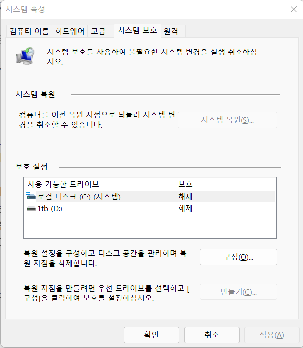 1. 위 I번 팁의 시스템속성에서 '고급' 바로 옆의 탭을 보면 '시스템보호'라는 탭이 있다.
