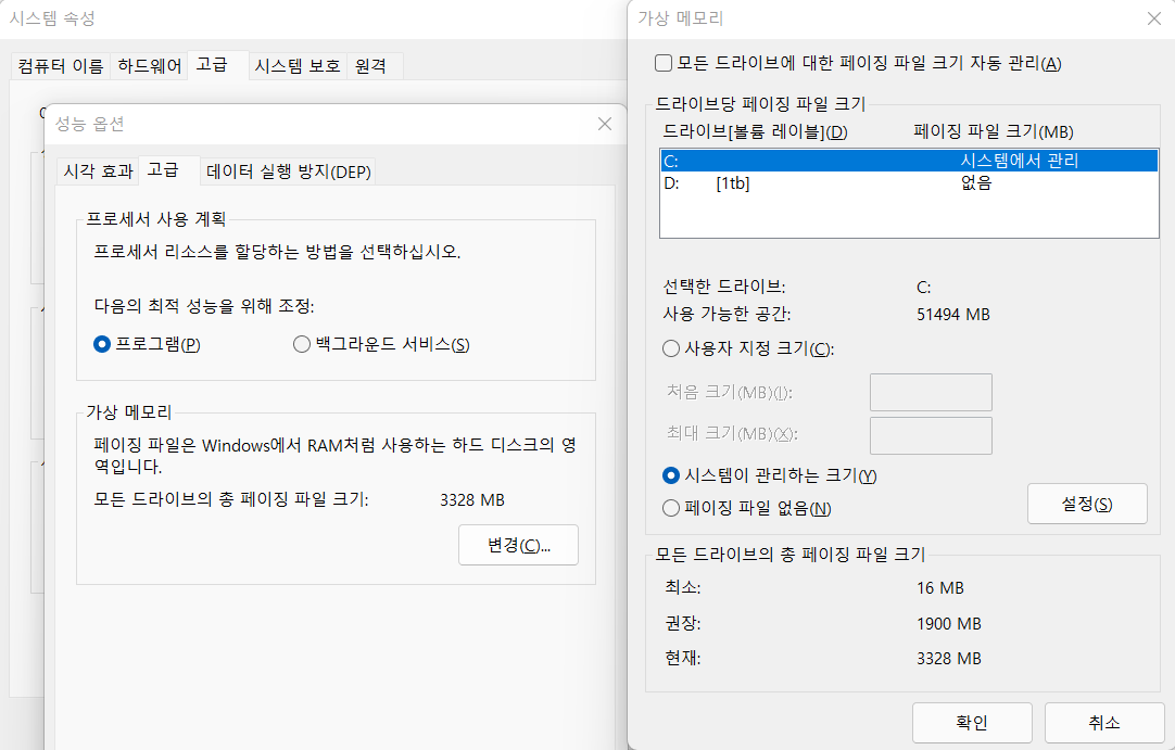 2. '시스템속성'창에서 '고급'탭→'성능'→'설정' 버튼 클릭